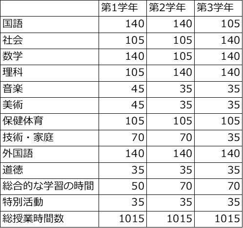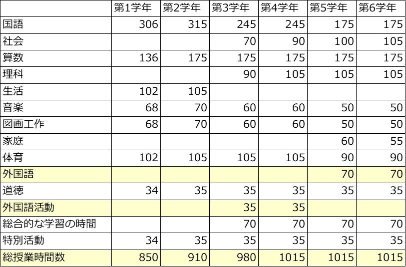 年間授業時間 新学習指導要領の全面的な実施は、小学校は2020年4月から、中学校は2021年4月からとなります。 ◆小学校 「年間授業時間数」 ※1単位時間は45分 「旧」学習指導要綱 2020年4月から全面実施 「新」学習指導要綱 3・4学年は「外国語活動」が新たに加わり、35単位時間増加。 5・6学年は「外国語活動」の35単位時間がなくなり、「外国語科」の授業時数が70単位時間増加となる。 総授業時間は、3~6学年で35単位時間数ずつ増加。 ◆中学校 「年間授業時間数 」 ※1単位時間は50分 中学校は2021年4月から適用 (授業時間数の変更はなし)